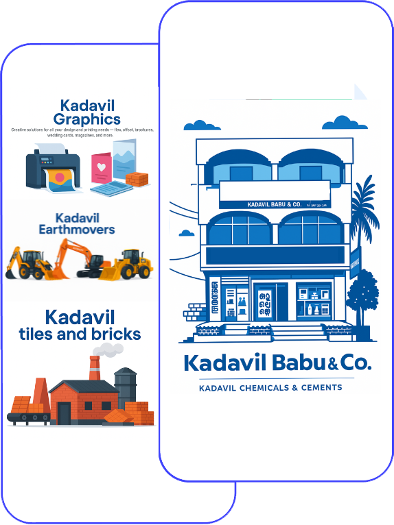 Kadavil Groups are an established business group, located at Tholicodu, Punalur, Kollam Dist, Kerala. Our business spread out to meet all your desires of a dream home. We fulfill all your construction needs from the foundation to the finishing touch. Kadavil Builders and Developers provide ground breaking equipment for your foundation requirements, and our building materials division, Kadavil Babu & Co. builds up your dream home into a reality. Kadavil bricks and tiles gives your home a dream come true exterior outlook. Our printing and publishing division, Kadavil Graphics meets all your multicolored printing needs from designing to publishing.